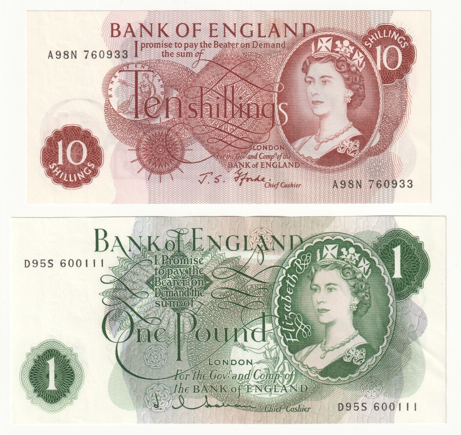 10 shillings one pound 5 pounds 10 pounds named because they were the first bank of england notes to bear the face of the monarch (queen elizabeth ii).